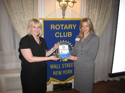At the October 14, 2009 meeting, Susanne Gellert, (right) the interim president of the The Rotary Club of Wall Street, welcomed the club’s first international visiting Rotarian, Elena Grigoreva. Elena (left) is from the Rotary Club of Moscow, one of the first Rotary clubs established in Russia in 1994. Elena, an attorney who is in New York on business, spoke briefly about some of the humanitarian projects that her club conducts in Moscow. While, no one can say for sure, the meeting of the two clubs would make Karl Marx and Adam Smith proud.